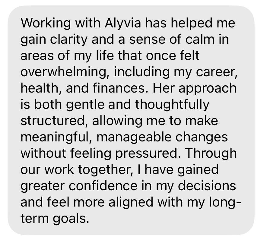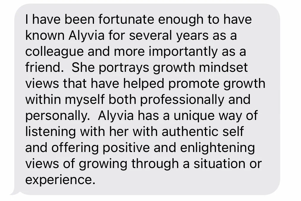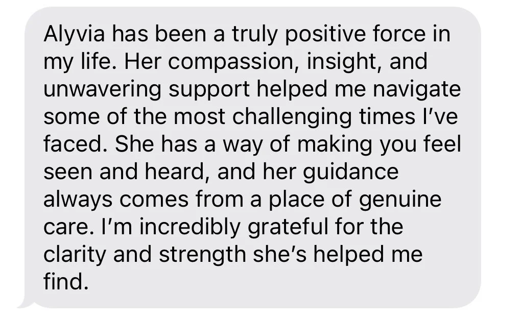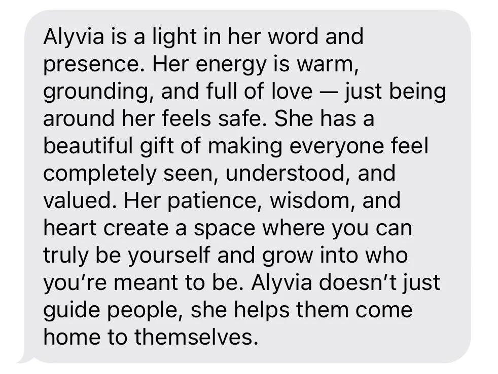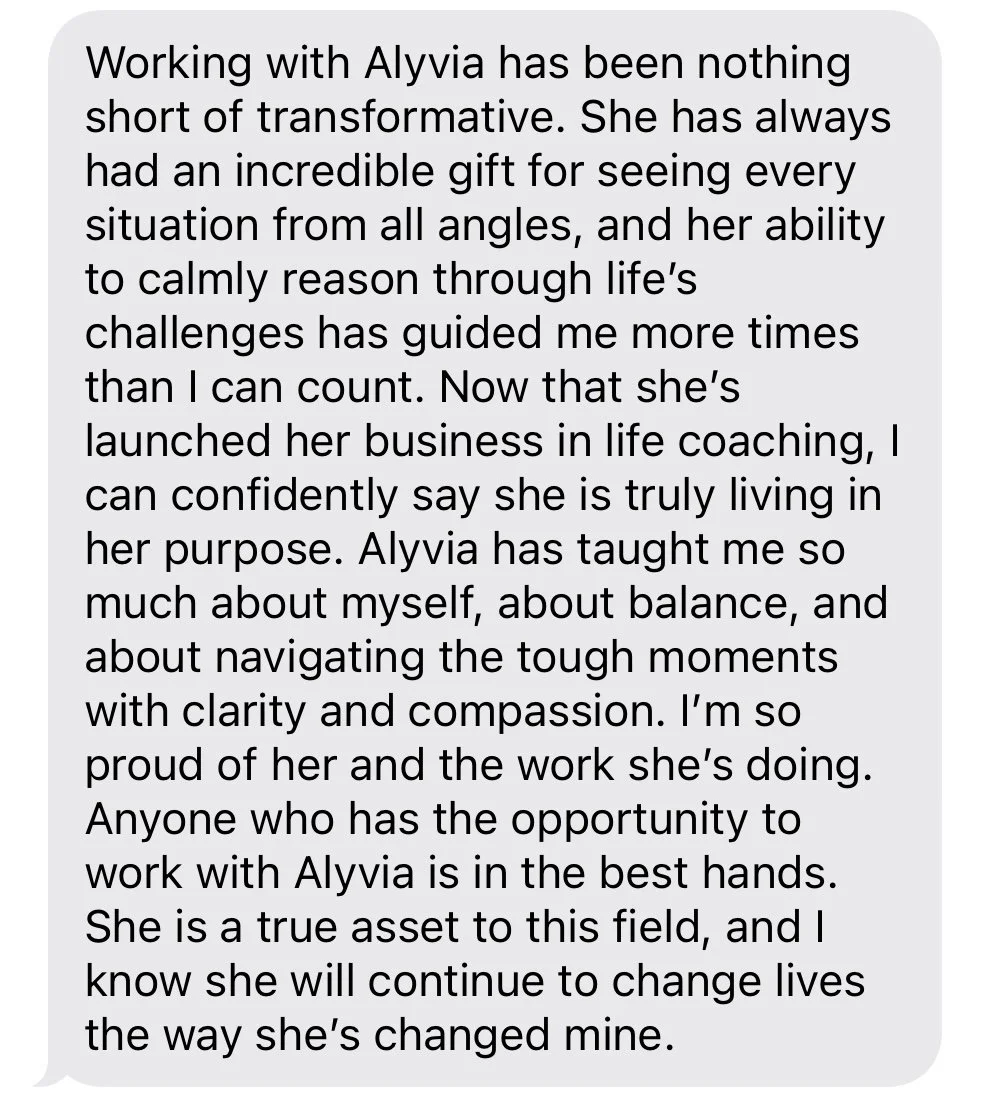 Stories of Growth & Connection The stories shared here come from people I’ve had the privilege of working with — as clients, colleagues, students, and friends.Each reflects a moment of growth, connection, or clarity — the heart of what Align with Alyvia stands for. Real stories • Real growth • Real connection • Real stories • Real growth • Real connection • Real stories • Real growth • Real connection •